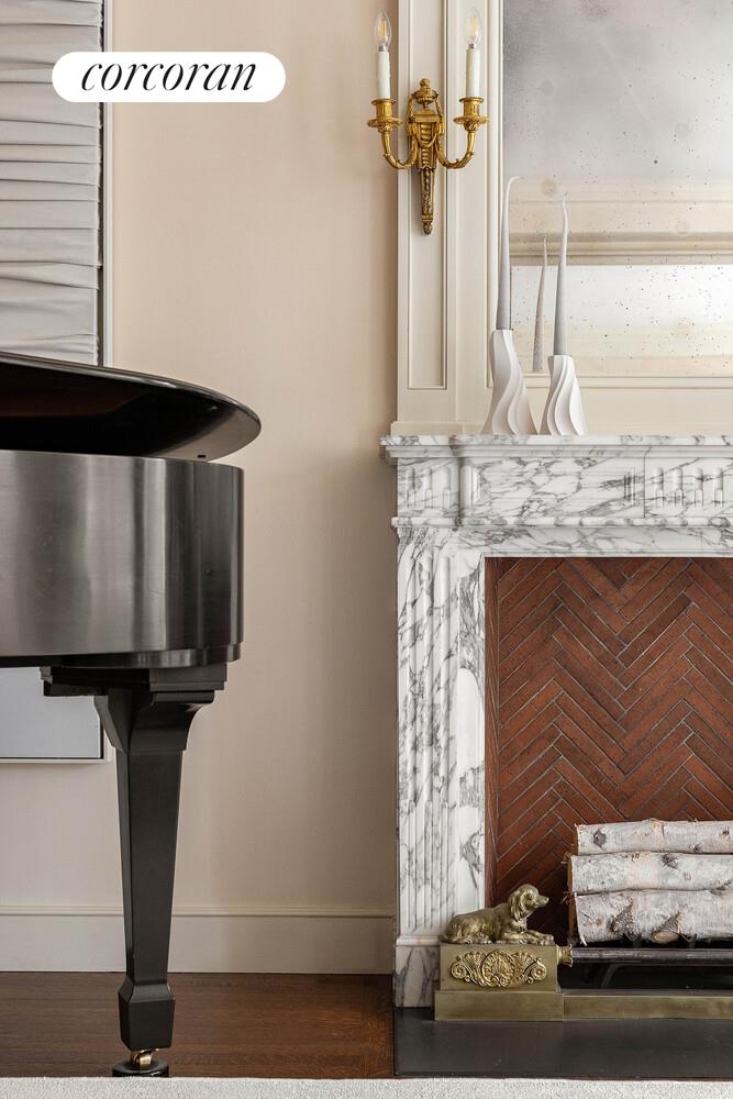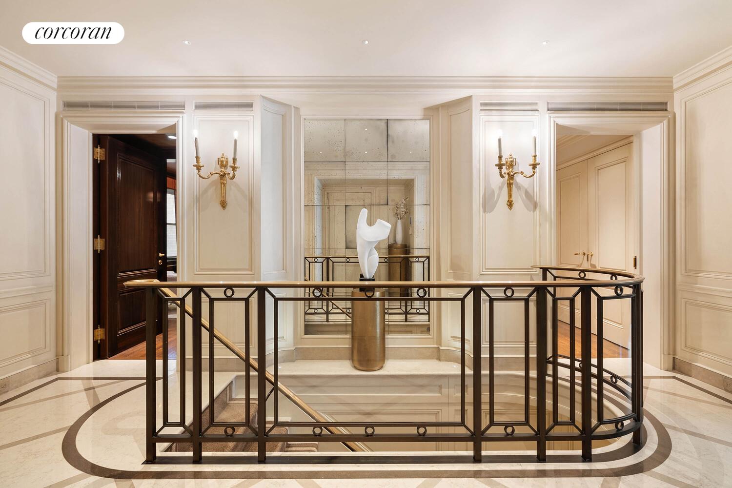 The upper floor is accessed via a semi-private elevator landing that opens to a gracious marble-clad gallery. A sweeping staircase elegantly connects the two levels of the home. On the southern end, a sun-drenched 16' x 28' living room offers panoramic views over the Rose Planetarium. This stately space accommodates multiple seating areas, with space for baby grand piano, and features a decorative fireplace.