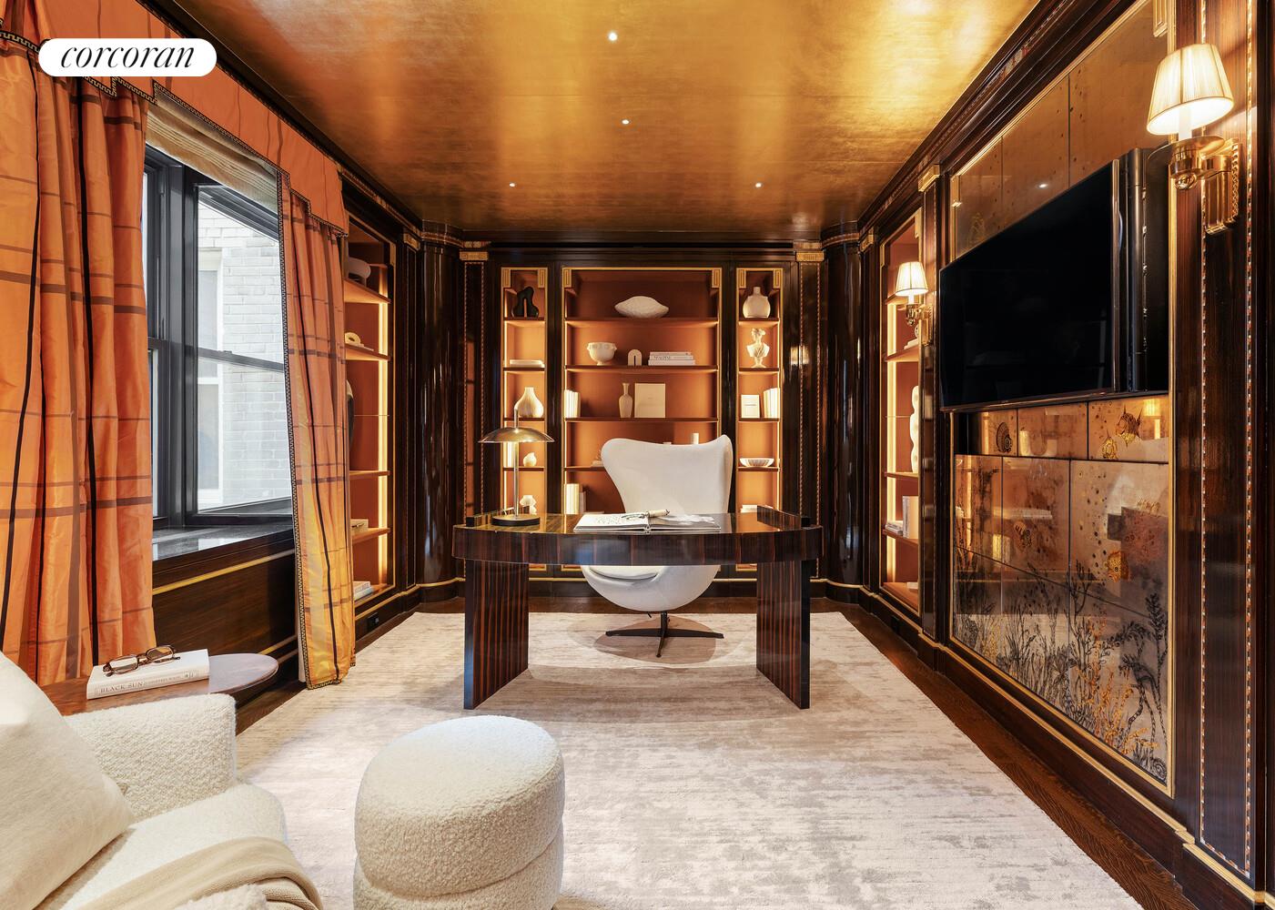 The custom Art Deco-inspired library is wrapped in high-gloss lacquered millwork with inlaid detailing, grounded by a luminous gold-leaf ceiling and ambient backlit shelving. A stunning verre glomis mirrored panel conceals a built-in television, etched with whimsical underwater motifs and framed in polished bronze. This atmospheric retreat is both sculptural and functional-perfect for reading, work, or quiet reflection.