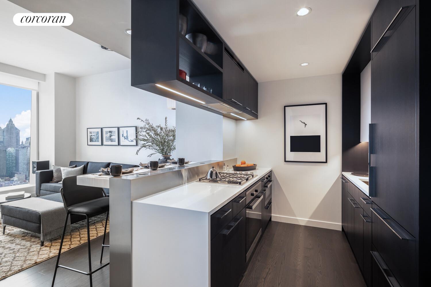 Residence 61L is a 709 square foot one bedroom, one bathroom with an open gourmet kitchen and breakfast bar. This spacious residence faces South West, with spectacular sunset views overlooking NY Harbor and the Downtown Skyline. Warm, modern interiors are brought to life by the renowned design team at Meyer Davis Studio. This residence features imported stone and custom finishes, premium Miele appliance package, 5" wide stained oak flooring, master bath with custom wood cabinetry, marble tile walls and mosaic floors with radiant heat, under-mount Wetstyle sink with glass vanity top and Dornbracht polished chrome faucets and a washer and dryer.