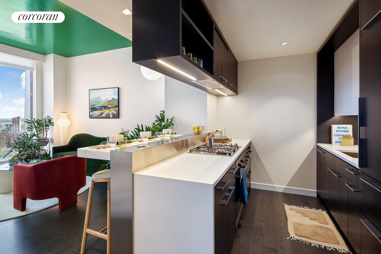 Residence 45F is a 722 square foot one bedroom, one bathroom with an open gourmet kitchen and breakfast bar. This spacious residence faces North East with East River and Williamsburg Bridge views. Warm, modern interiors are brought to life by the renowned design team at Meyer Davis Studio. This residence features imported stone and custom finishes, premium Miele appliance package, 5" wide stained oak flooring, master bath with custom wood cabinetry, marble tile walls and mosaic floors with radiant heat, under-mount Wetstyle sink with glass vanity top and Dornbracht polished chrome faucets and a washer and dryer.