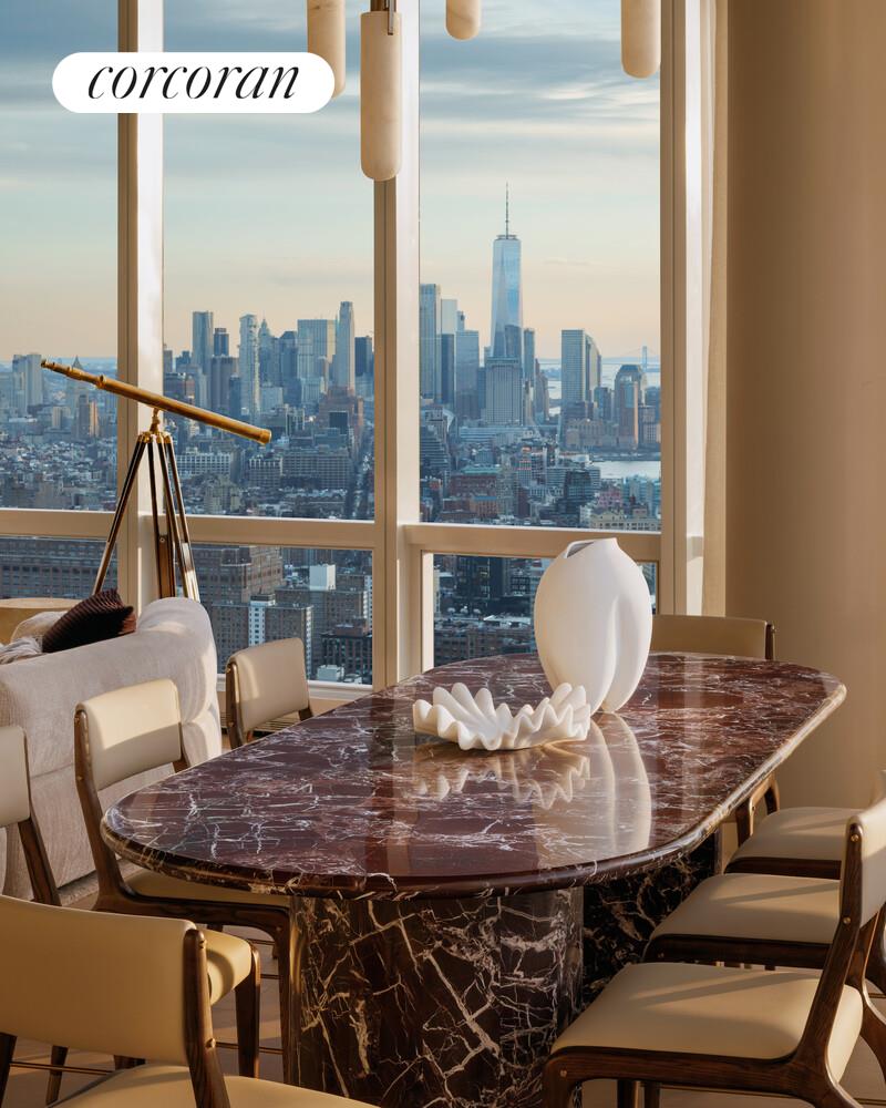 Located on the prized southwest corner of Fifteen Hudson Yards, this remarkable home enjoys grand proportions and mesmerizing views of the Hudson River, New York Harbor, Statue of Liberty, Freedom Tower and Downtown skyline from morning to night! The gracious 6-foot wide foyer leads to the giant great room with ceilings up to 10'10" and stunning views in every direction. The oversized open kitchen features a grand marble island, Bulthaup cabinetry with large pantry and Miele appliances including double ovens and wine storage. The master suite is very private, enjoying river views, an oversized bathroom with soaking tub and large shower and two massive walk-in closets. Two additional bedroom suites enjoy en-suite baths and a walk-in laundry room, while the fourth bedroom could also double as a library, office or media room and could be opened to the great room if desired.