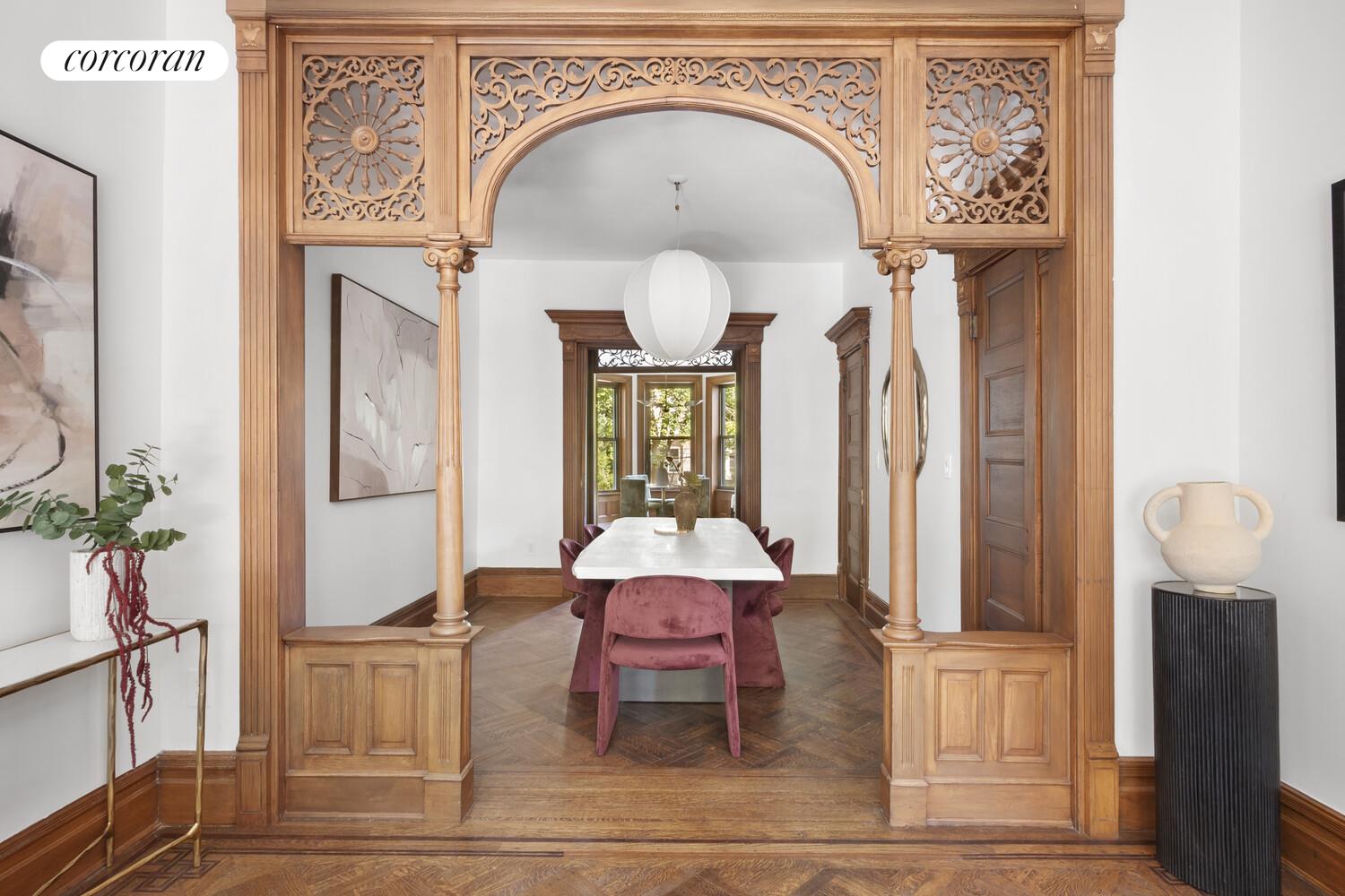 The living and dining rooms come complete with original ceiling medallions and decorative details, brand new barrel windows topped with stained glass, original floor-to ceiling mirrors with carved wood frames, and stylish pendant lighting. This level has its own convenient half bath, as well.