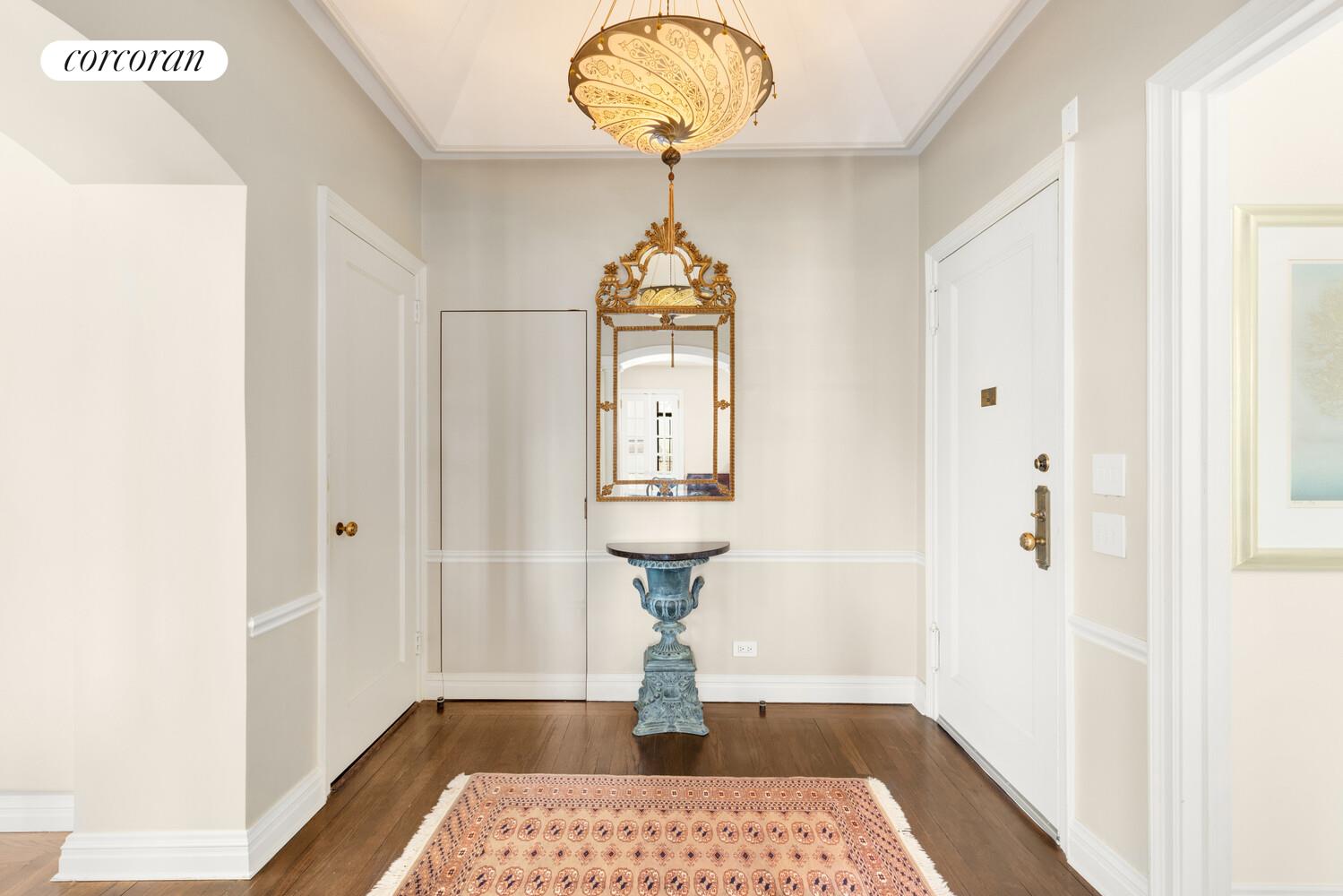 Off the entry foyer is a private hallway to the bathroom and bedroom, a great place for hanging artwork. The 12 x 12 foot king-sized sunlit, south-facing bedroom is spacious enough for a dresser and seating, and features a wall of beautifully appointed closets with mirrored doors and a cove ceiling reaching 9 feet 7 inches in height. The elegant bathroom includes a granite-topped vanity and walk-in shower with Waterworks and Coventry fixtures, and a spacious closet housing a convenient LG WASHER DRYER.