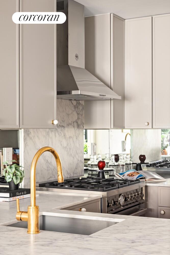 Regardless of which floor best suits your needs, all of the spaces have been outfitted with a suite of luxury finishes and amenities that include central AC, chef's kitchens, oversized bathrooms with natural stone, great closets, LG washers and dryers, hardwood floors, and all new double-pane windows. The first and second floor units are oriented to the private gardens with spacious kitchens and living spaces that flow perfectly to the private yards. The upper two units have been flipped, and enjoy street-facing park and treetop views facing south from the extra-wide living and dining spaces. The inspired kitchens include custom warm gray cabinetry; brass hardware; honed Carrara marble countertops, backsplash and island; and unique mirrored backsplashes that bring in dappled light all day long. Enjoy an oversized stainless steel Bertazzoni fridge, range and dishwasher, beautifully complementing the stylish aesthetic seen throughout.