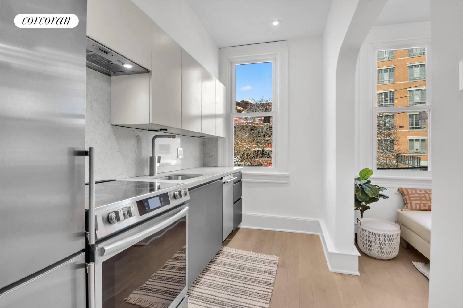 The fully renovated kitchen is a true standout, featuring quartzite countertops and backsplash, a stainless steel sink with Grohe faucet, soft-close cabinetry with interior lighting, recessed lighting, and top-of-the-line stainless steel appliances including a stainless interior dishwasher, a European-style refrigerator/freezer with adjustable temperature zones, and a fully featured electric range with a bridging cooktop.