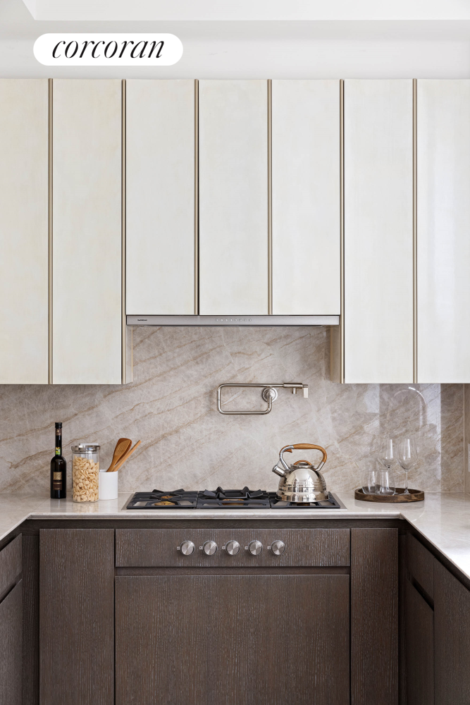 Custom crafted by Studio Sofield, the eat-in kitchen features beautiful Cristallo Gold quartzite countertops and backsplash, custom hand-crafted lacquered millwork, and a top-of-the-line appliance package by Gaggenau . Every detail, from the materials to the finishes, was carefully selected to enhance functionality and style.