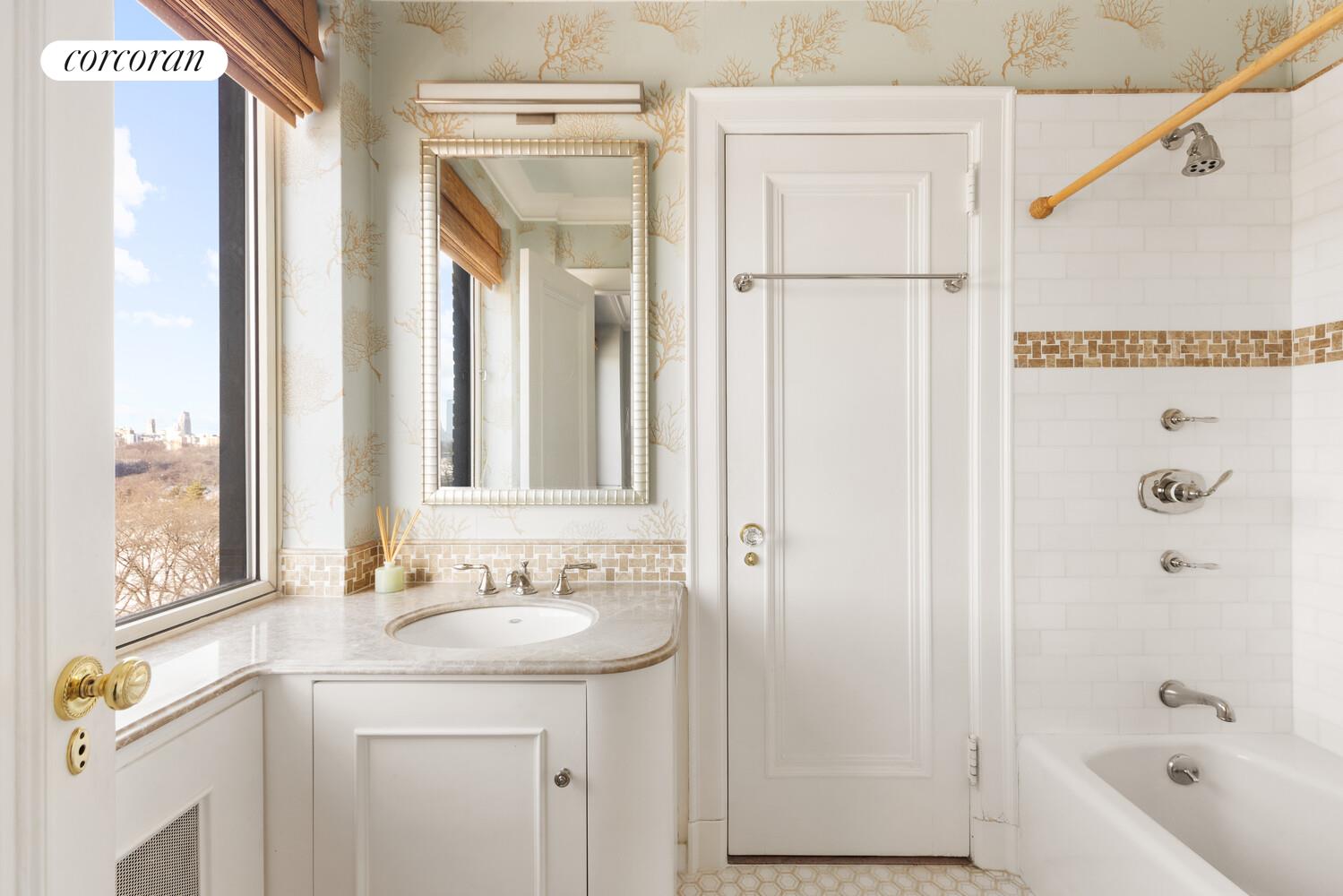 The corner primary suite features ample closets along the entrance hall and a full en-suite bathroom. The windows look South and West over the Park.