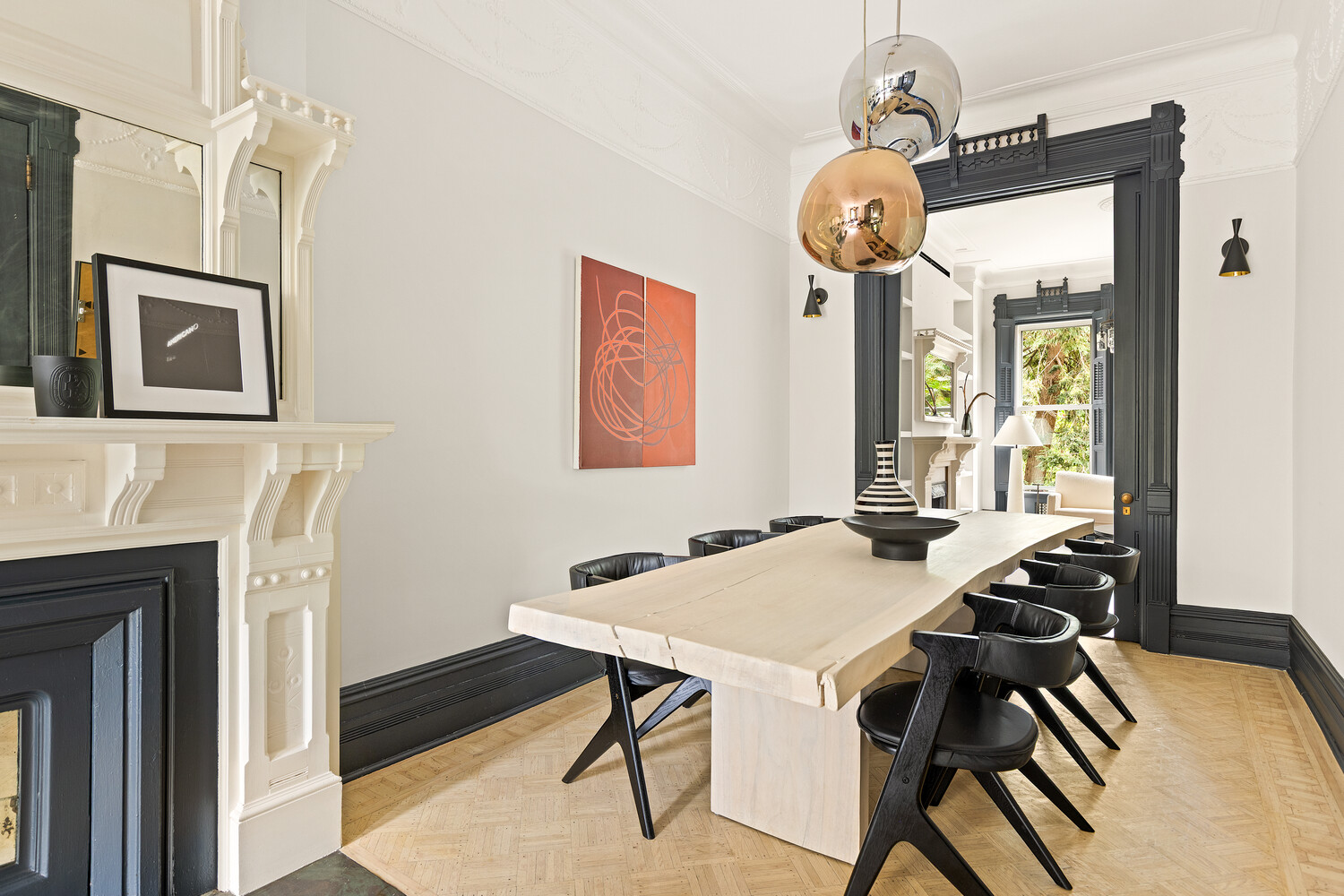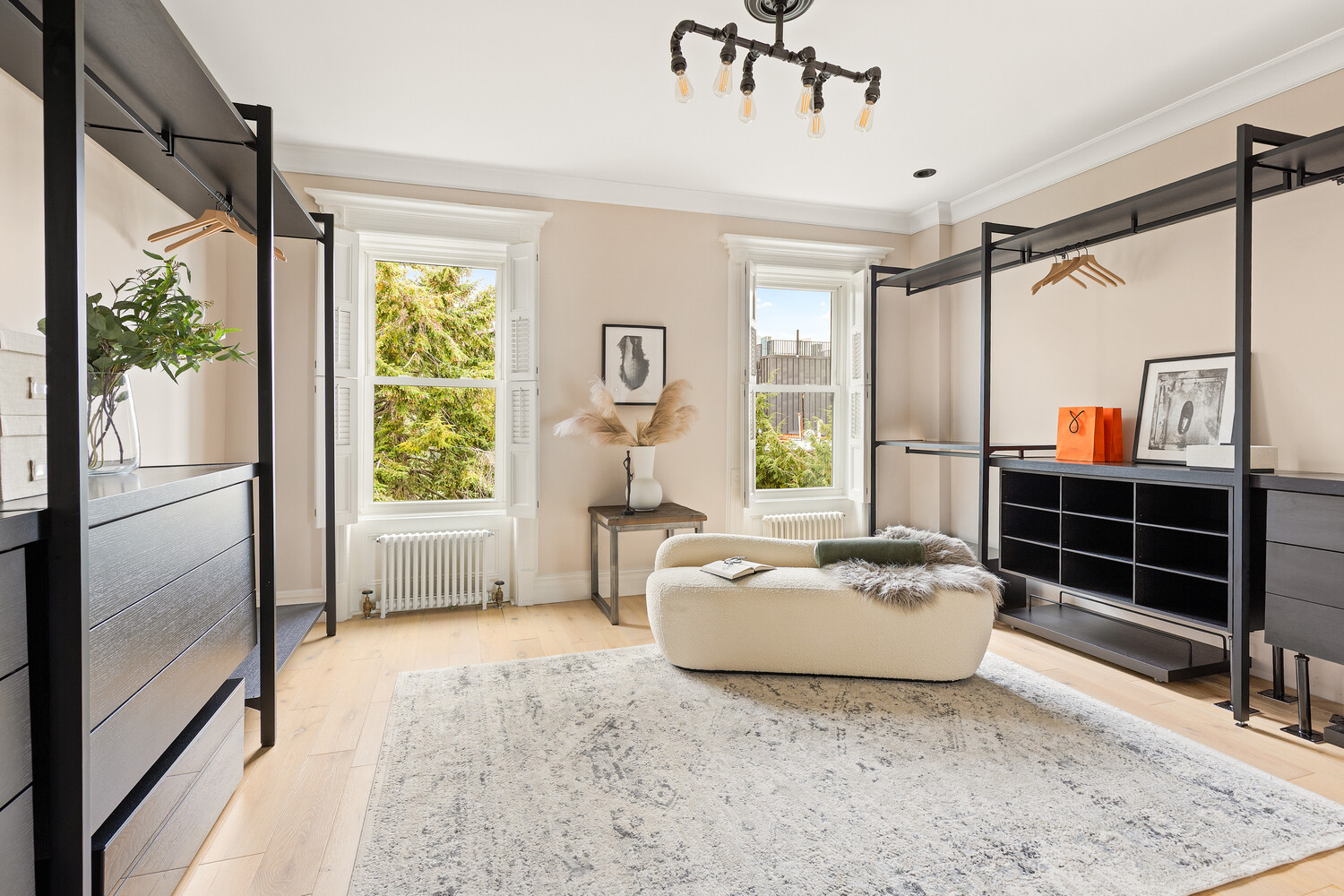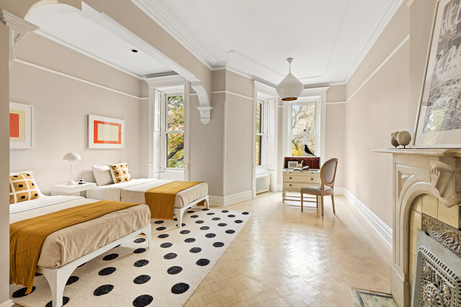 On the parlor floor, the home's historic character shines through. Original entrance doors, period moldings, and beautifully preserved wood fireplace bring 19th-century elegance to life. Arched doorways and carved wood details add architectural richness, while the formal dining area, which comfortably seats ten, is flanked by two sunlit living areas with floor-to-ceiling windows.