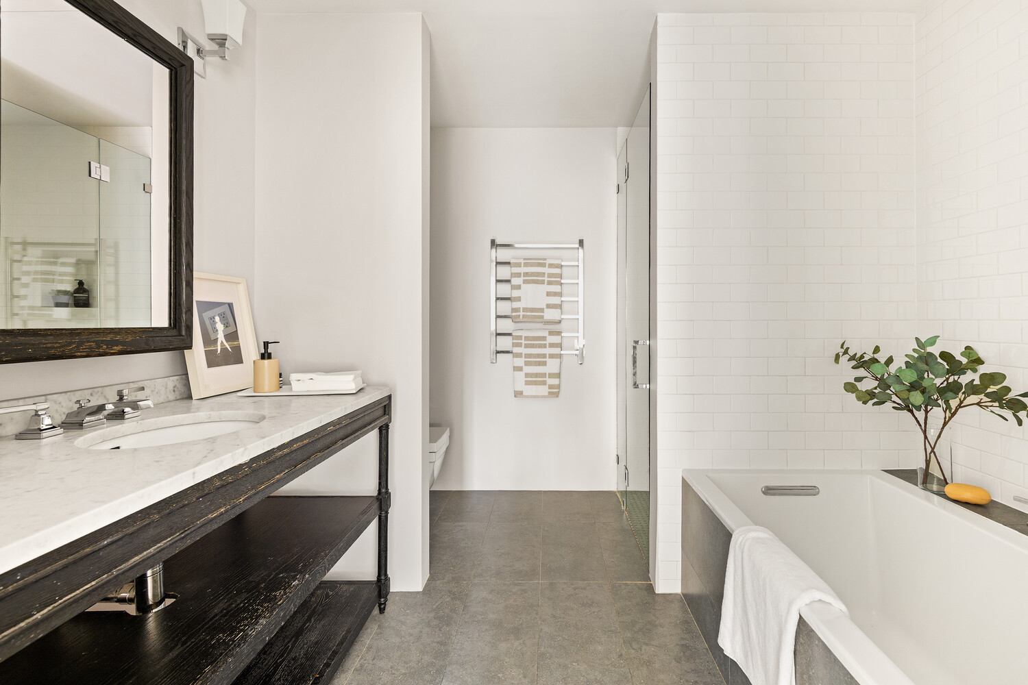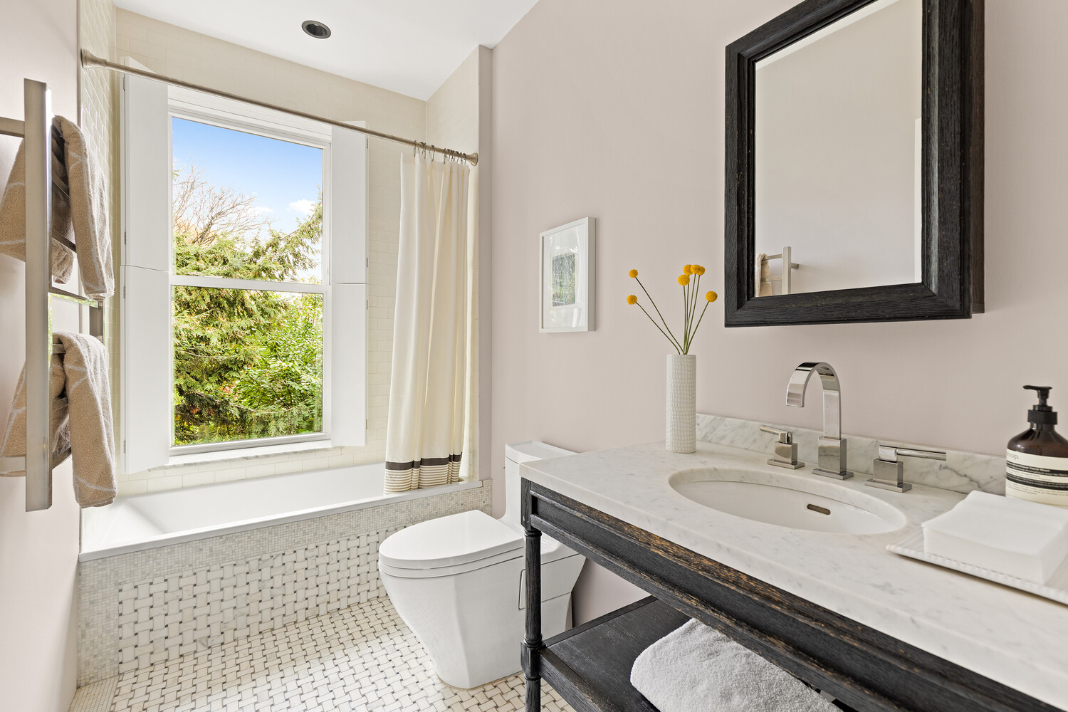 The third floor hosts a spacious bedroom with a marble fireplace, an en-suite bath, a second bedroom, and a full hallway bathroom featuring a picture window. All bathrooms throughout the top three floors are finished with premium tile and fixtures, and feature heated floors for added comfort.