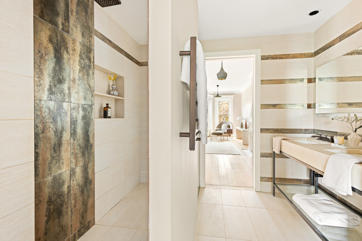 The top floor is dedicated to the luxurious primary suite, again with a marble mantle, complete with a walk-in rain shower, dual showerheads, and high-end fixtures. Bespoke lighting and flooring throughout the primary floor, as well as the entire home.