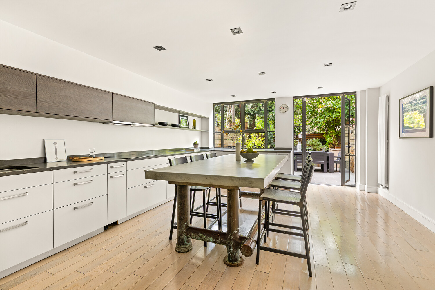 The garden level opens with a flexible living or dining space featuring a decorative fireplace-tailor it to suit your lifestyle. The sun-drenched kitchen is a true highlight, with a wall of windows looking out to the garden and a large island that doubles as a dining table-ideal for everyday meals or homework. Step outside to a peaceful backyard oasis with a patio for al fresco dining and custom wooden planters, perfect for gardening.