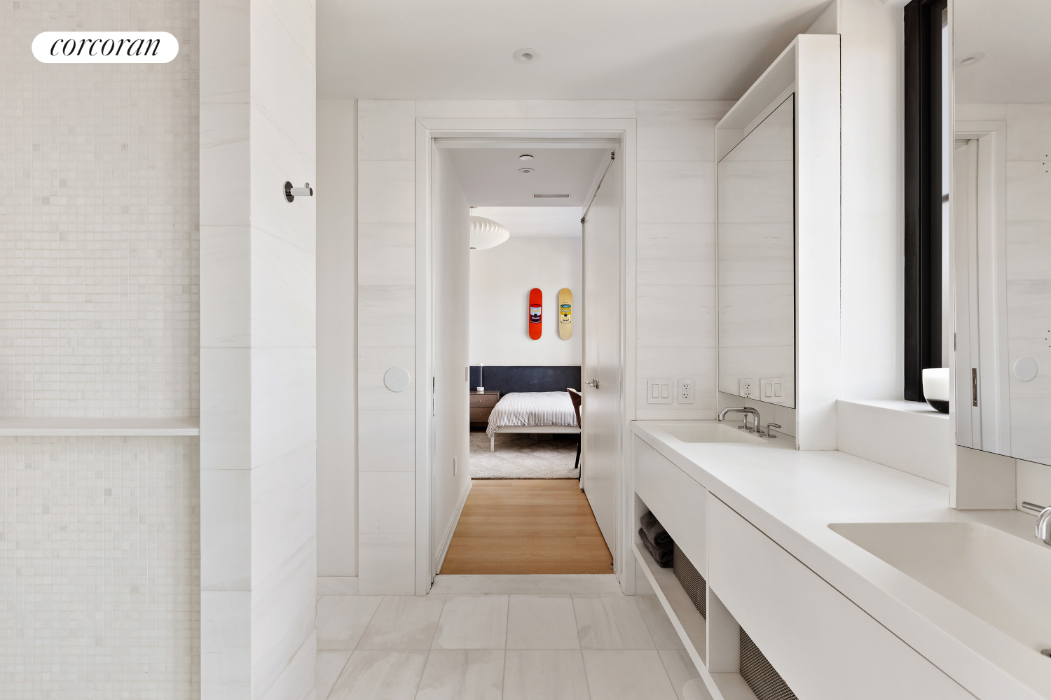 The current layout includes four bedrooms, three full bathrooms, and one powder room. The north-facing primary suite is a serene retreat offering open city views, two walk-in closets, and a spa-like marble bath with radiant heated floors, soaking tub, and a glass-enclosed rain shower. Each additional bedroom is well-proportioned and features en-suite access, walk-in closets, custom built-ins, and generous light.