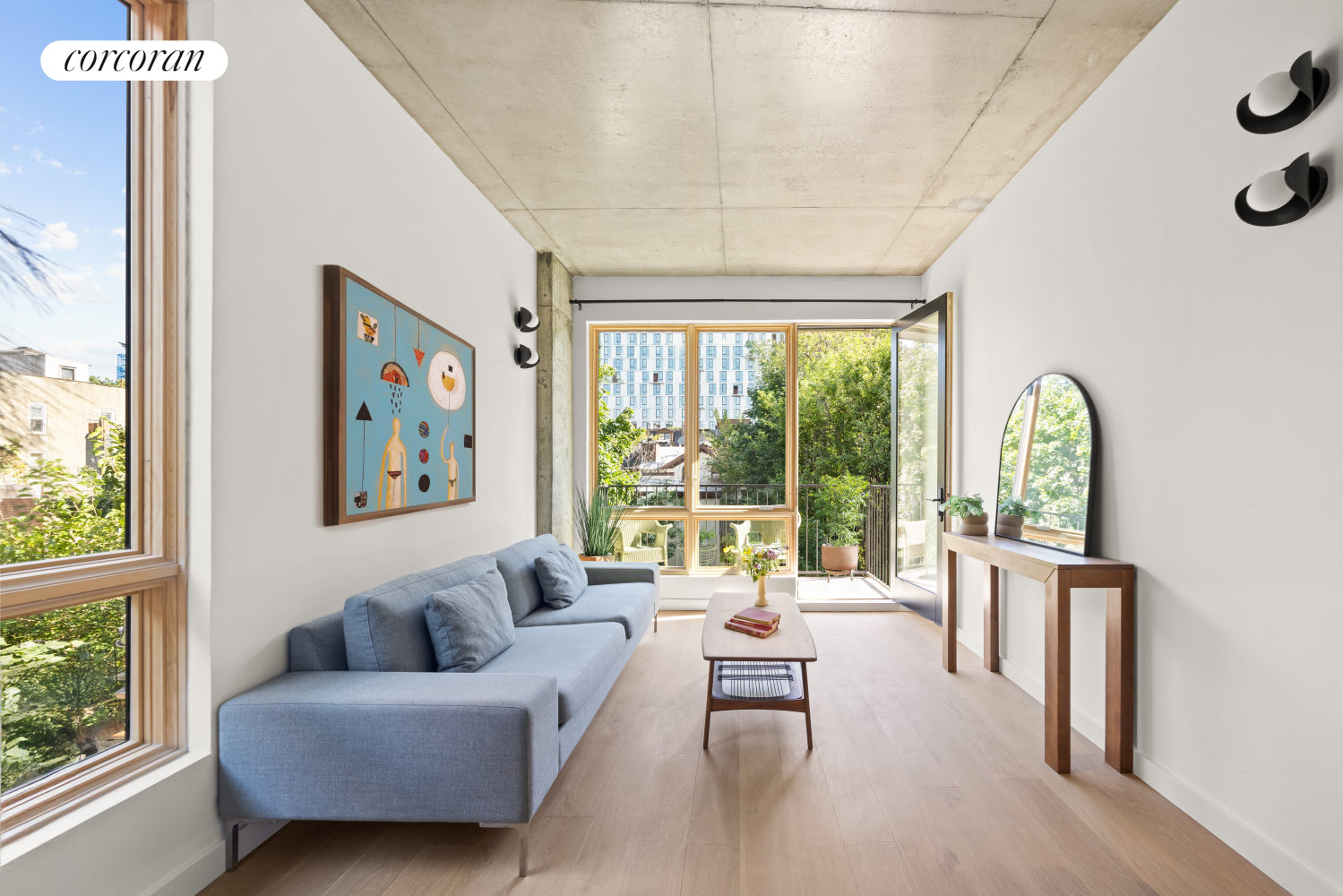 Unit 5F is a chic one-bedroom, one-bathroom residence offering 618 square feet of well-designed living space, plus the added bonus of a private balcony just off the living room. With its loft-like industrial aesthetic, this north-facing home features dramatic exposed concrete ceilings and oversized windows that fill the space with natural light throughout the day.