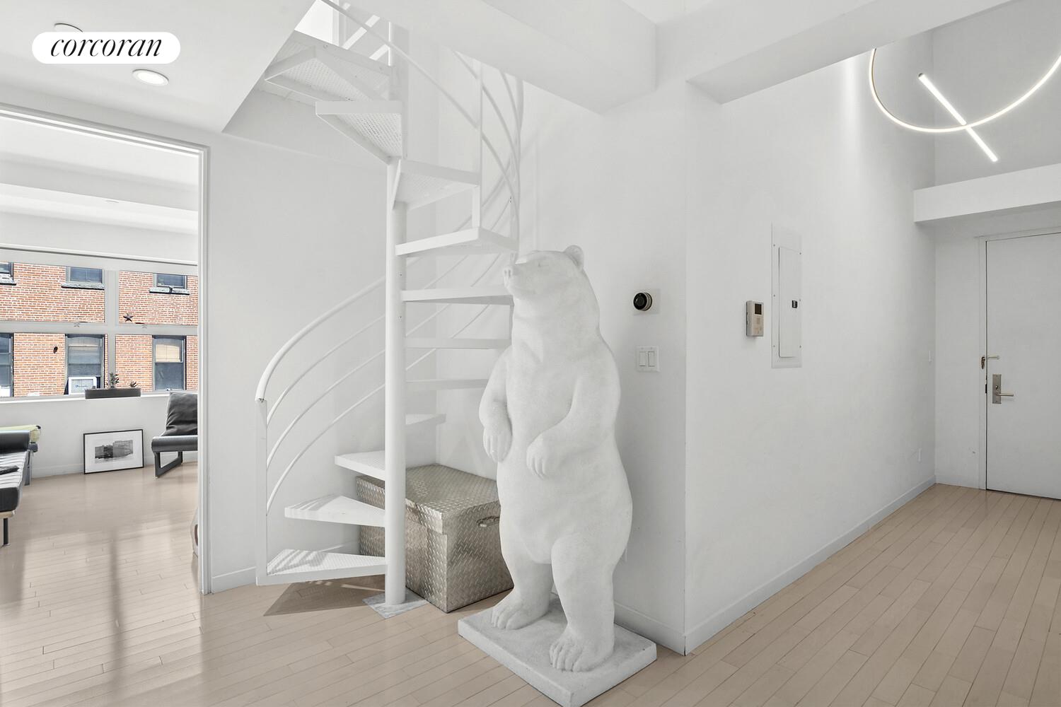 A bespoke spiral staircase leads to a charming sleeping loft on the upper floor, providing versatile space for rest or creative pursuits. Additional amenities include a private storage unit for convenient organization.