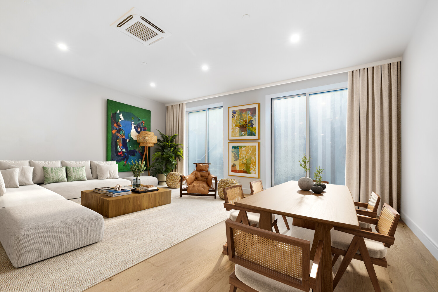 Inside, each home is outfitted with a refined palette of materials that blend modern sophistication with organic warmth. Environmentally conscious wide-plank white oak flooring adds a grounding elegance, while oversized windows and 10ft ceilings that flood the interiors with natural light create a sense of airiness and flow.