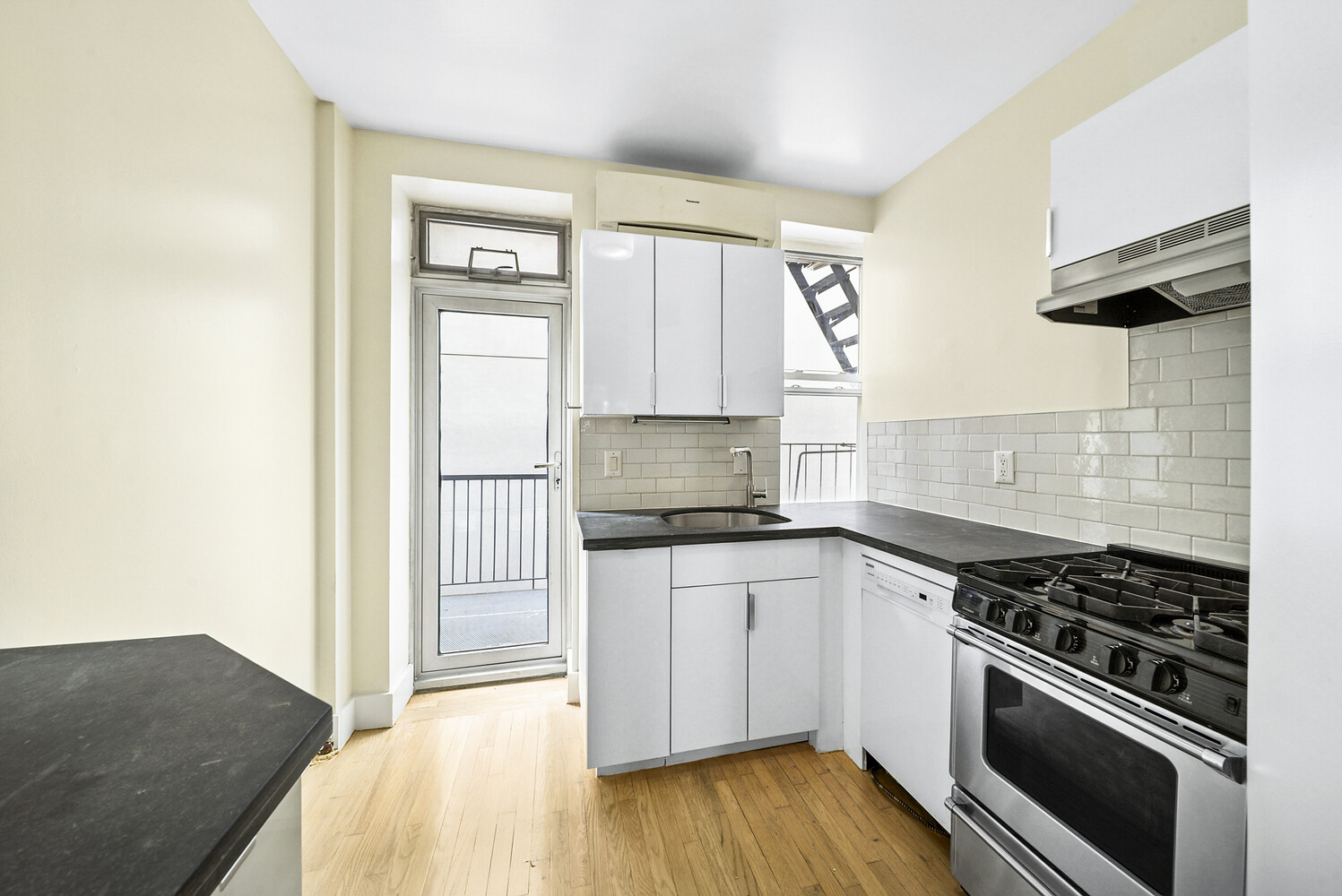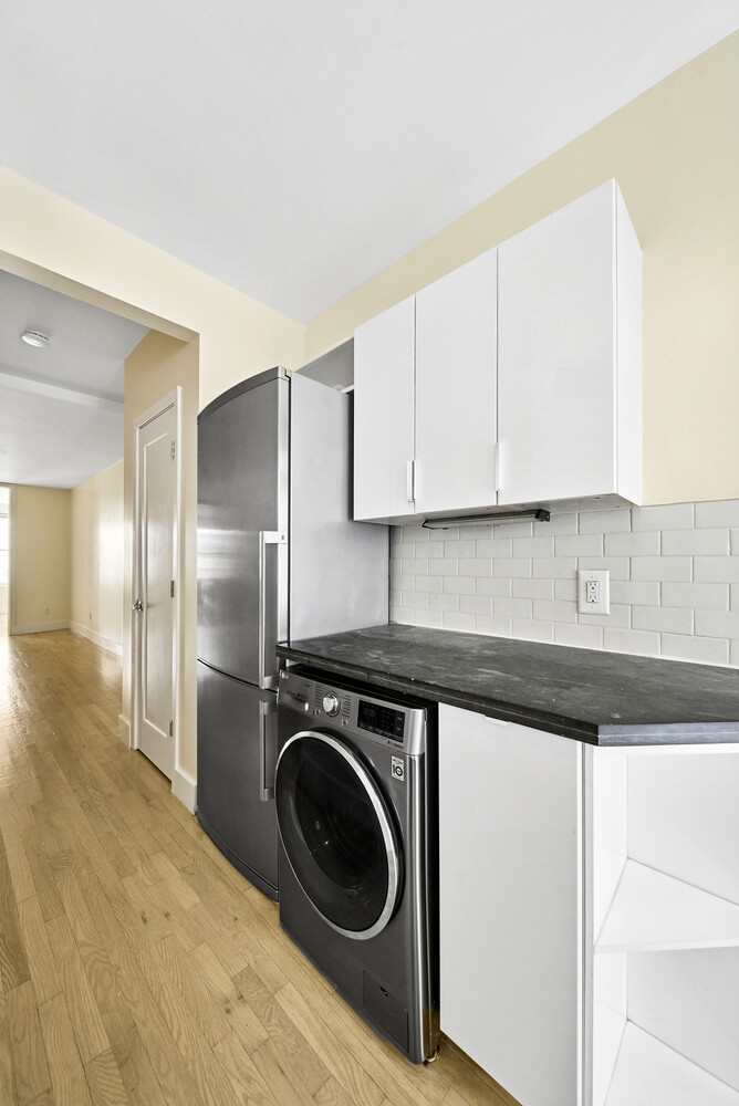 This expansive floor-through one-bedroom home offers a true sense of space with its oversized living and dining area, seamlessly connected to a king-sized bedroom with room for additional storage. The thoughtfully designed kitchen features white lacquer cabinetry, a gas range, dishwasher, and washer/dryer combo, while a private balcony just off the kitchen provides the perfect retreat for morning coffee or evening dining.