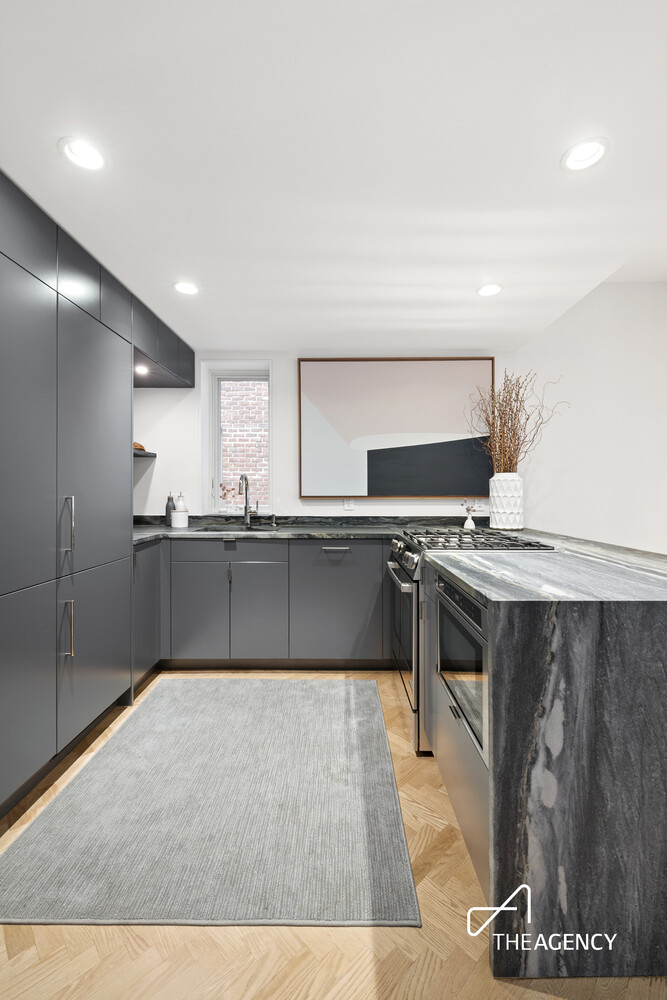 The kitchen has been reconfigured with Brazilian marble counters, handcrafted cabinetry, and a suite of seamlessly integrated appliances by Bosch, Miele, and Liebherr. A luminous living room flows into a defined dining area, where a Bocci pendant hovers against a backdrop of exposed brick and oversized windows. With entertaining spaces on a separate level from the bedrooms, the layout is as functional as it is stylish.