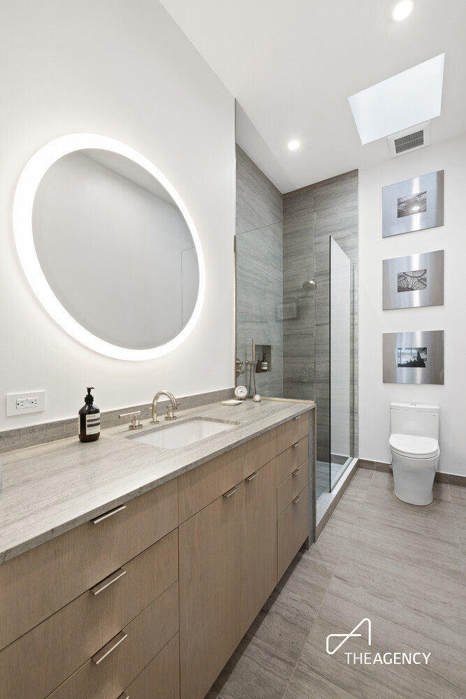 The primary suite is a serene retreat, distinguished by high ceilings, motorized Roman shades, a custom walk-in closet, and a skylit en-suite bath. Clad in Pelle Grigio stone, the bathroom is appointed with Newport fixtures, a Robern illuminated mirror, and a Toto toilet. The second bedroom, also accented with exposed brick and abundant natural light, is served by a nearby bath finished in Schumacher grasscloth, Circa sconces, Newport hardware, and its own skylight. Additional closets ensure generous storage.