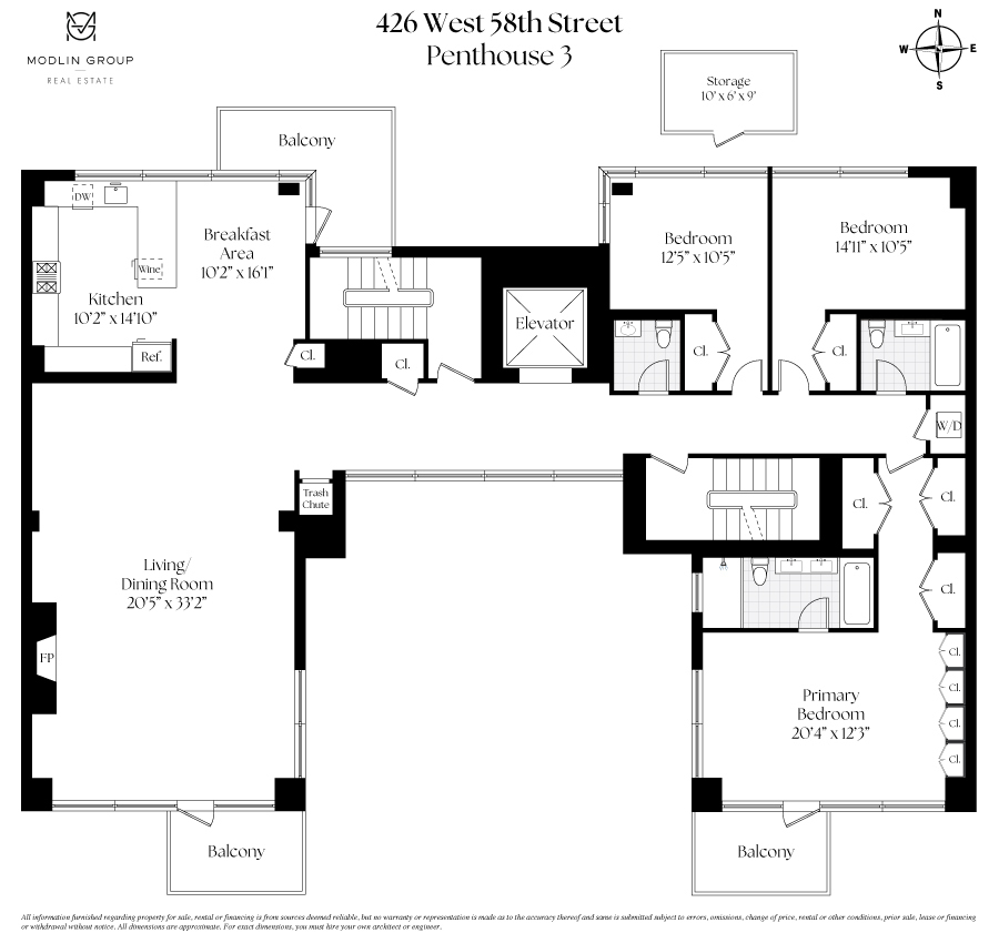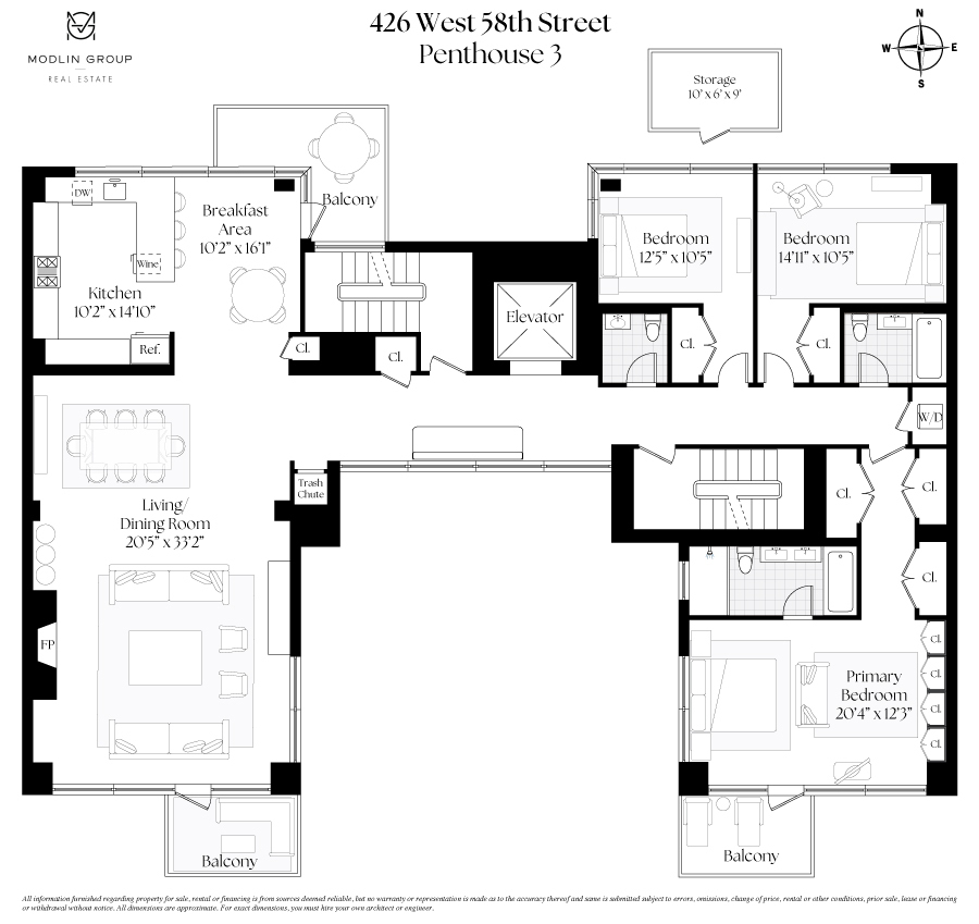 426 West 58th Street is a full-service, white glove condominium building with amenities that include a 24-hour doorman, a state-of-the-art fitness center, a private storage unit that conveys with the apartment, and a bicycle room. Steps from Central Park and Columbus Circle, in the middle of Manhattan’s bustling center, as well as the city’s finest dining and shopping, this incredible penthouse embodies sophistication and luxury. Some photos are virtually staged.