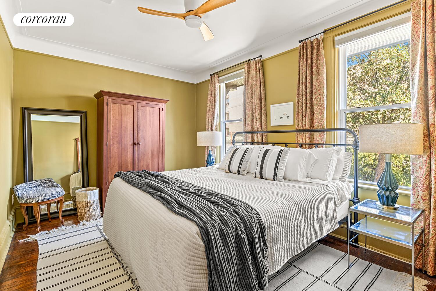 Additional highlights include abundant storage, central air and heat, oversized windows, ceiling fans, skylights, hardwood floors throughout, and private parking right in front.