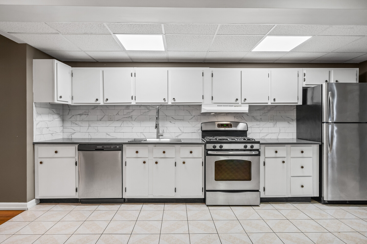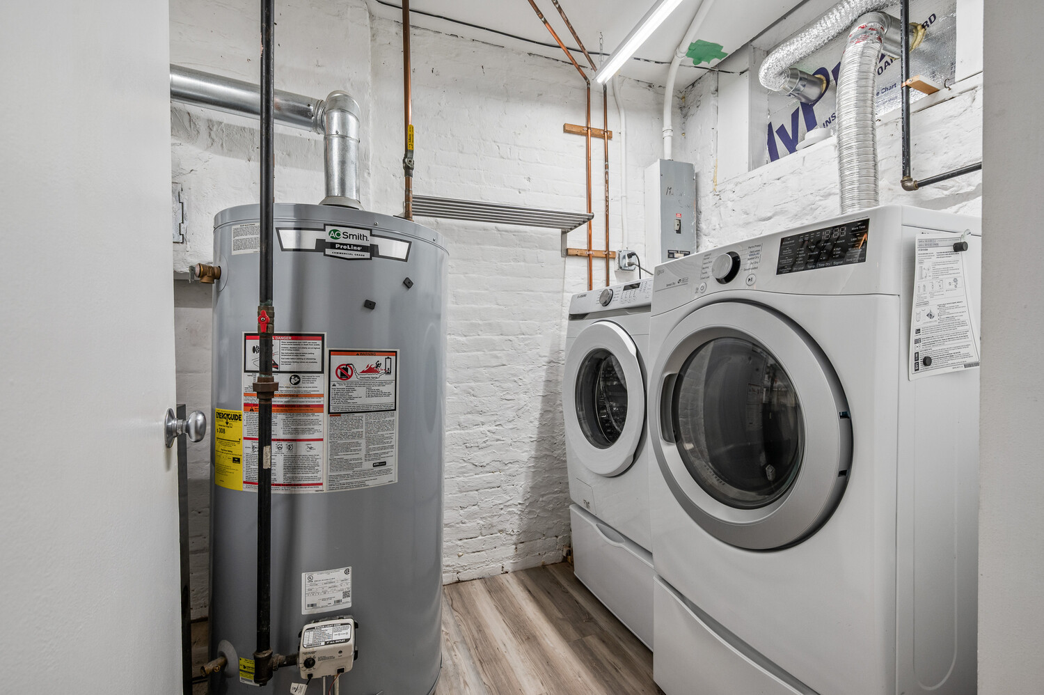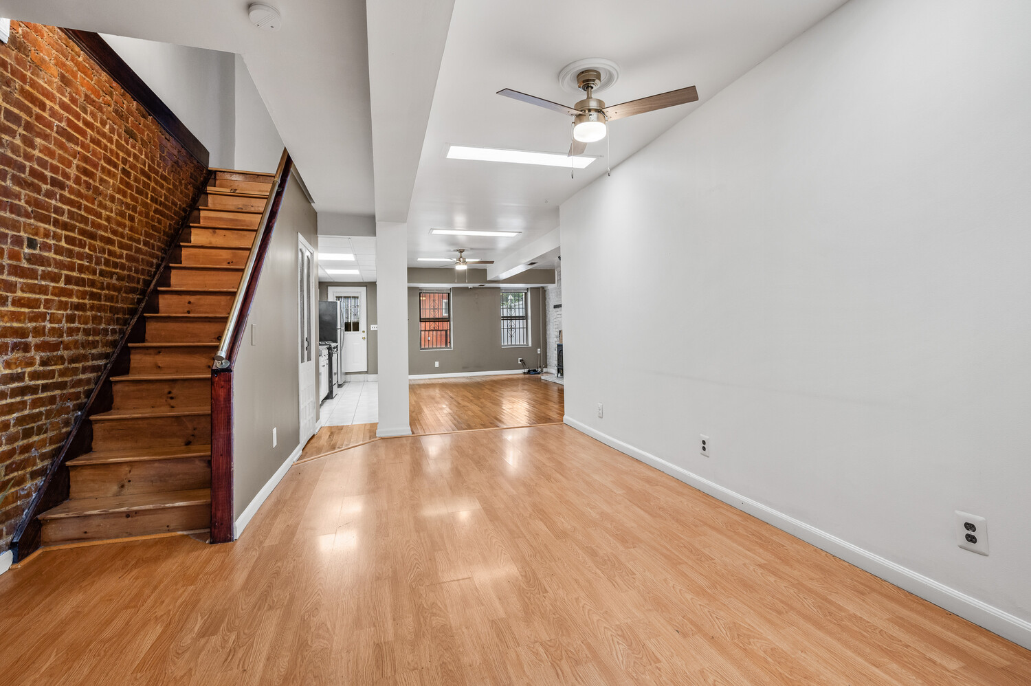 The owner's duplex spans the garden and parlor levels, offering a spacious, open-plan layout that balances original character with everyday functionality. The garden level includes a renovated kitchen with stainless-steel appliances, tiled backsplash, and abundant cabinetry, seamlessly flowing into a large living and dining area with exposed brick and a decorative fireplace. This level also features a newly renovated full bath and a dedicated laundry room with new washer/dryer and updated mechanicals. Upstairs, three well-proportioned bedrooms and another full bath provide comfort and flexibility for everyday use - whether as sleeping quarters, a home office, or guest space.