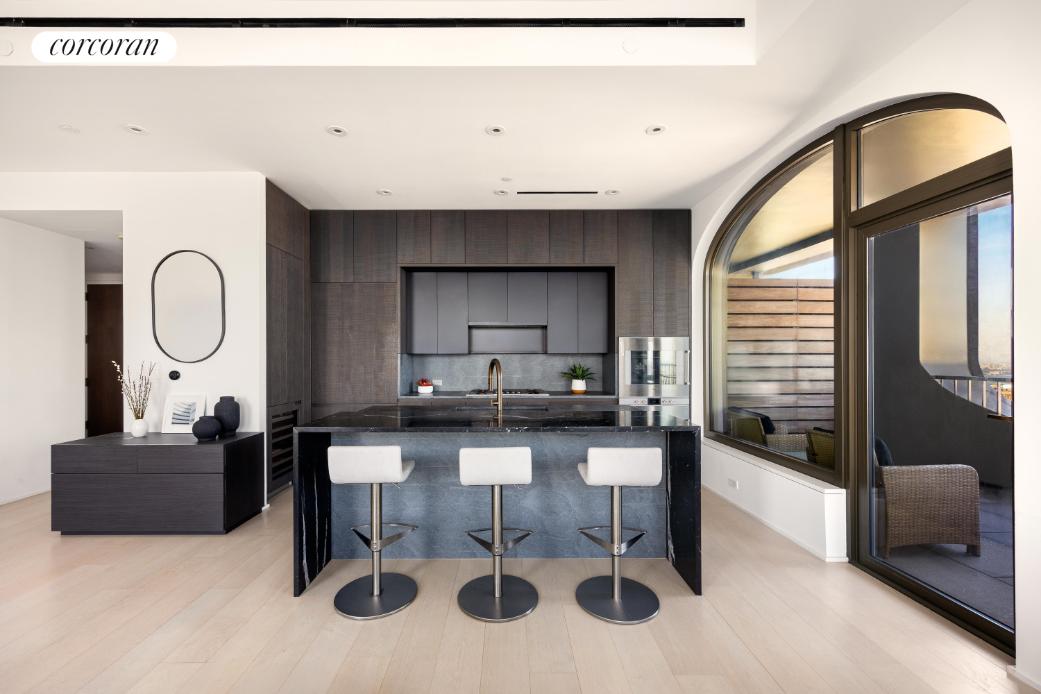 Loggia 59B is a breathtaking 2-bedroom, 2.5-bath penthouse designed for the most discerning buyer. Perched high above Manhattan, this residence offers awe-inspiring panoramic views of downtown, the East and Hudson Rivers, the Freedom Tower, and beyond. From the moment you enter, you are enveloped in sophistication-soaring ceilings, pristine Parisian White Oak flooring, and grand arched windows framing the city skyline. The expansive great room seamlessly connects to a spectacular bronze-detailed private loggia terrace, extending both bedrooms and the living space for a true indoor-outdoor lifestyle.