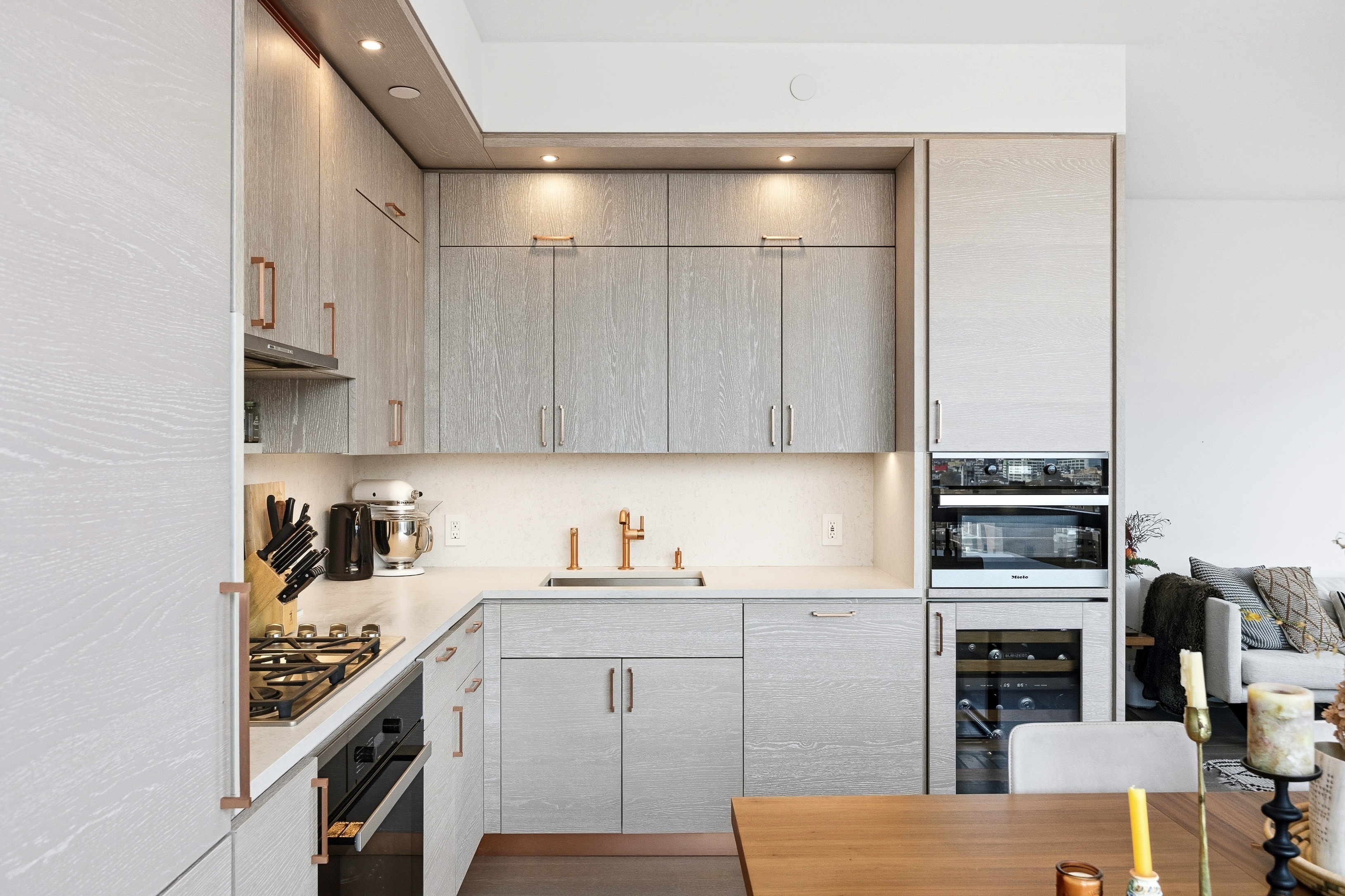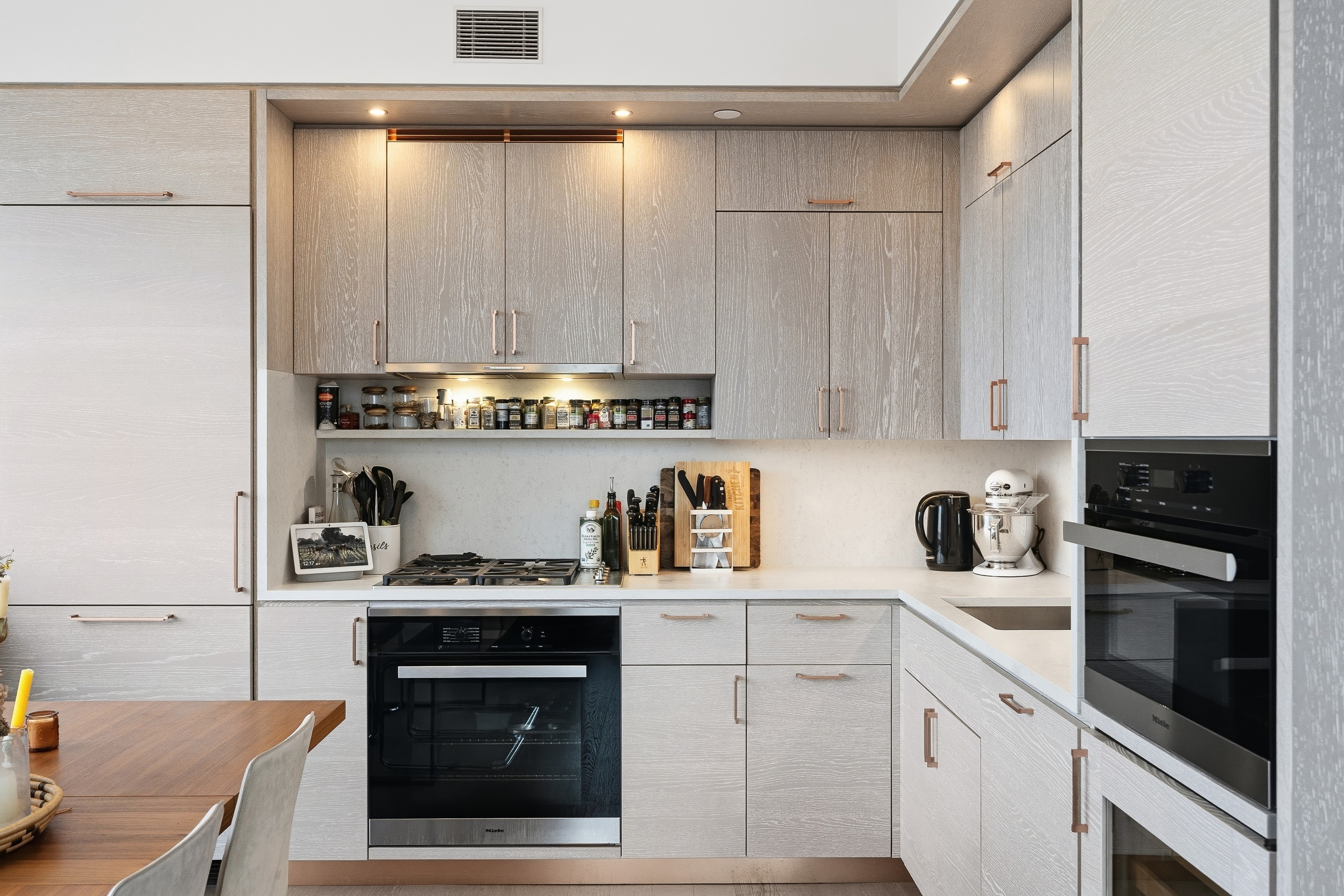• Designer kitchen with custom cabinetry, stone countertops, and integrated premium appliances