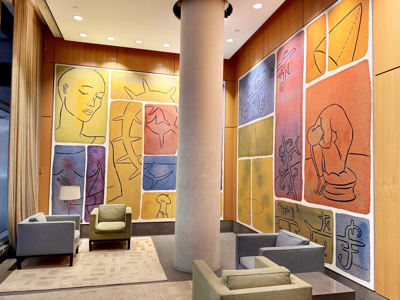 Resident-only amenities and services include a 24-hour doorman, concierge and valet, large fitness room, dining room and lounge, a fully equipped professional catering kitchen, Wi-Fi business center with conference space, and an outdoor deck with seating.