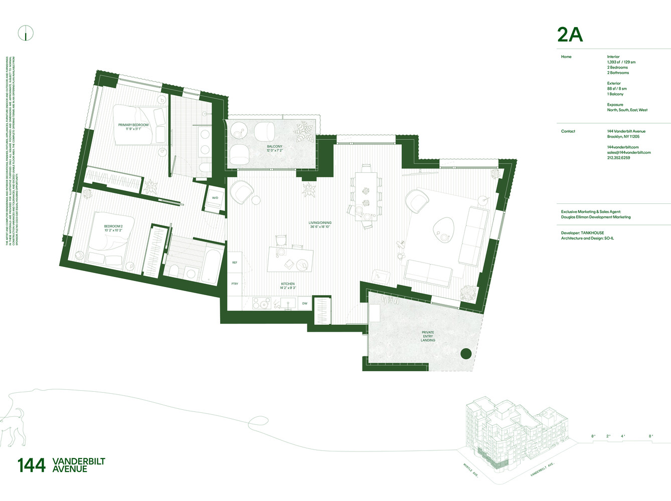 Corner Residence 2A comprises 1,393 SF and offers two bedrooms, two bathrooms, and North, South, East, and West exposures. This residence also provides the flexibility to be converted into a three-bedroom layout. Upon arrival through a private entry landing, white oak floors, exposed concrete ceilings, and abundant natural light from the large south-facing windows in the living and dining area set the tone for modern, design-forward living.